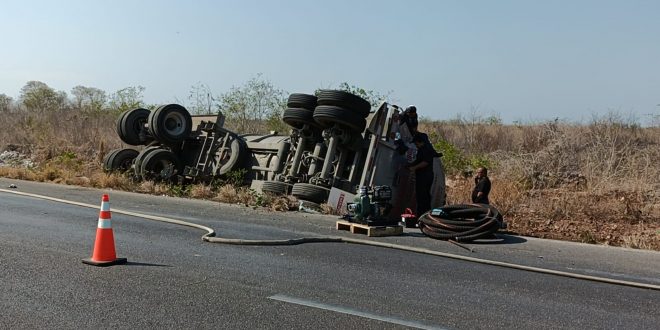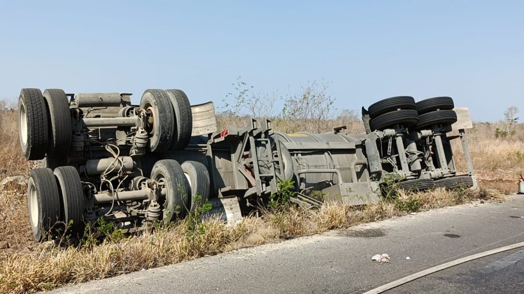 Acanceh, Yuc., a 05 de junio 2024.- Fuera del asfalto y volcado quedó uno de los remolques que arrastraba un tractocamión sobre la carretera Mérida-Valladolid, el cual estaba cargado con miles de litros de turbosina, que es combustible para aeronaves.