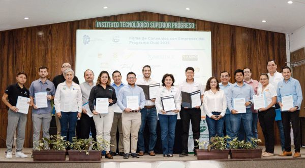 PROGRESO, Yuc., 06 de marzo 2023.- El Instituto Tecnológico Superior Progreso firma convenio con 16 empresas líderes de la región a través del programa de modelo dual, beneficiando a 46 estudiantes de diferentes ingenierías, con el objetivo de asegurar la empleabilidad e impulsar la cualificación profesional de los ingenieros en formación en un sistema de alternancia de actividad laboral en una empresa, con la actividad formativa recibida en el marco del procedimiento de educación de nivel superior para su desarrollo académico y profesional. Indicó la directora Lic. María del Carmen Ordaz Martínez.