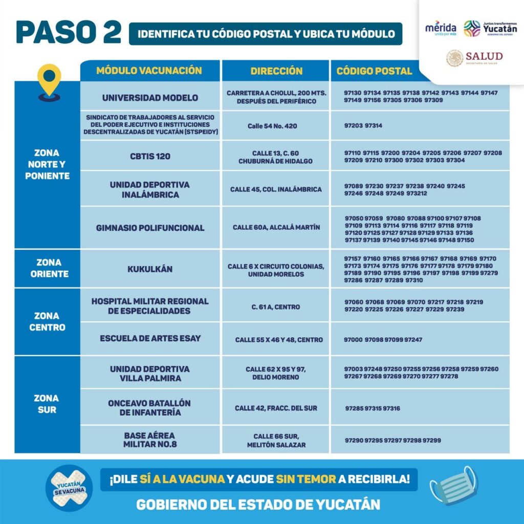 Cabe recordar que el macrocentro o módulo de vacunación que les corresponde será con base en su Código Postal, los cuales estarán distribuido de la siguiente forma: