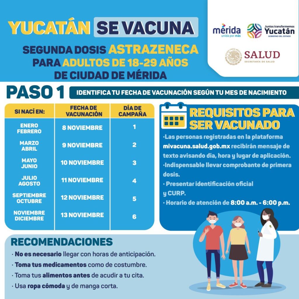 Mérida, Yucatán, 4 de noviembre de 2021.- Del lunes 8 al sábado 13 de noviembre se aplicará la segunda dosis de la vacuna contra el Coronavirus a jóvenes de 18 a 29 años de Mérida, proceso que se realizará de manera coordinada entre el Gobierno del Estado, el Ayuntamiento de Mérida y la Secretaría de Bienestar.