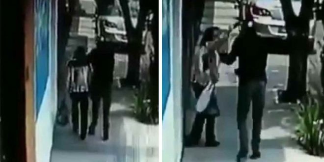 Al rodearla con los brazos, la mujer quien cargaba unas bolsas de plástico, se voltea y forcejea con el sujeto hasta lograr librarse, incluso le suelta un manotazo para posteriormente echarse a correr.