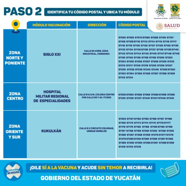 En el caso de Mérida, la SSY puntualizó que el proceso de aplicación de la segunda dosis a las personas de 50 a 59 años se estará llevando del viernes 23 al domingo 25 julio en los macrocentros habilitados en el Centro de Convenciones Yucatán Siglo XXI y la Unidad Deportiva Kukulcán, así como en el módulo del Hospital Militar Regional de Especialidades.