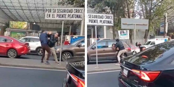 Las imágenes muestran a un hombre de chaleco azul que golpea a otro de chamarra negra en el camellón de avenida Universidad cerca de Río Churubusco, frente al Hospital Adolfo López Mateos.