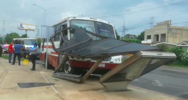 Los hechos se registraron sobre la 50 sur, poco después del periférico de Mérida, cuando el guiador del ‘camión’ transitaba de Sur a Norte rumbo al centro de Mérida, pero debido al piso mojado perdió el control de la unidad y destrozó un paradero ubicado en esa zona.