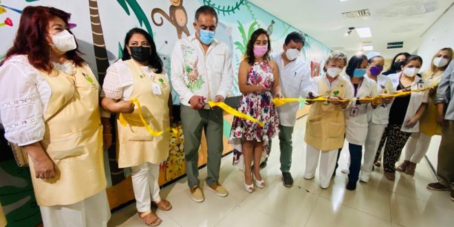 Mérida, Yucatán, a 15 de diciembre de 2022.- Con el objetivo de reconfortar y brindar alegría a los niños que se encuentran en momentos vulnerables al estar hospitalizados, así como a sus padres que velan por ellos, el voluntariado del Instituto Mexicano del Seguro Social (IMSS) en Yucatán, como parte de sus labores altruistas, donó la elaboración de una serie de murales a cargo del artista plástico Juan Octavio Peniche, quien a través de sus trabajo, plasmó imágenes alegres y cálidas en el área de Pediatría del Hospital General Regional (HGR) No.1.