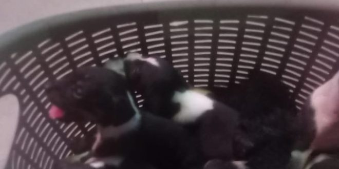 En la imagen se ve cómo 12 perritos de color negro fueron dejados a su suerte en un cesto de color gris.
