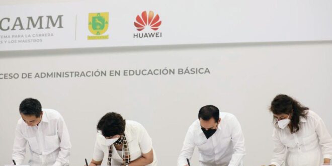 Desde el Centro Internacional de Congresos (CIC), Vila Dosal y Gómez Álvarez atestiguaron la firma de un convenio entre la Unidad del Sistema para la Carrera de las Maestras y los Maestros (Usicamm) y Huawei, para brindar a docentes yucatecos, en un programa piloto, el Curso de habilidades digitales del proceso de admisión en Educación Básica, correspondiente al ciclo escolar 2022-2023.