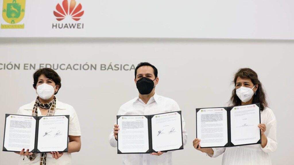 -El Gobernador y la titular de la Secretaría de Educación federal, Delfina Gómez Álvarez, atestiguaron la firma de convenio de la Usicamm con la empresa Huawei, para capacitar a docentes yucatecos en habilidades digitales.