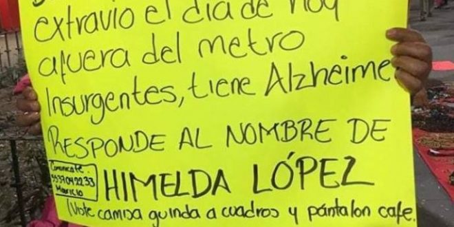 Ayer salimos al mercado a comprar nuestro mandado y salí con mi esposa que está malita de Alzheimer y siempre la agarro de la mano, pero ayer que salimos del Metro Insurgentes, siempre la dejo caminando sola porque no hay riesgo, pero había mucha gente, yo la iba vigilando, pero un momento de esos, me adelante un poco y ya no la vi”, relató Odón Mendoza.
