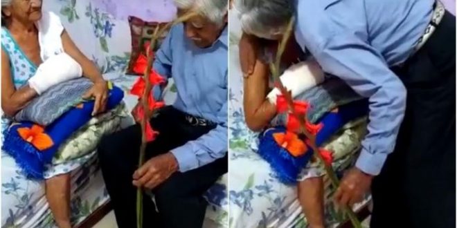 A pesar de que se desconoce el origen y la fecha del video, el anciano no puede evitar llorar cuando sentado en la sala de su casa con un ramito de flores comienza a decirle a su esposa lo mucho que la ama.
