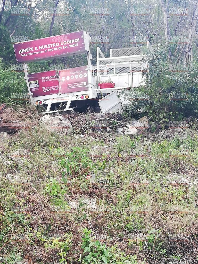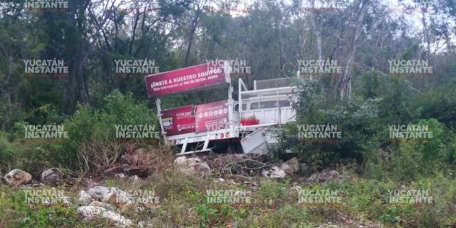 Kinchil, Yuc., a 07 de enero.- Los siniestros viales empezaron con todo este año en el angosto tramo Kinchil-Celestún, en esta ocasión el guiador de un camión repartidor de materiales termino en los montes y todo por un ‘coyotito’.