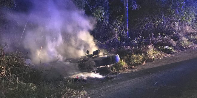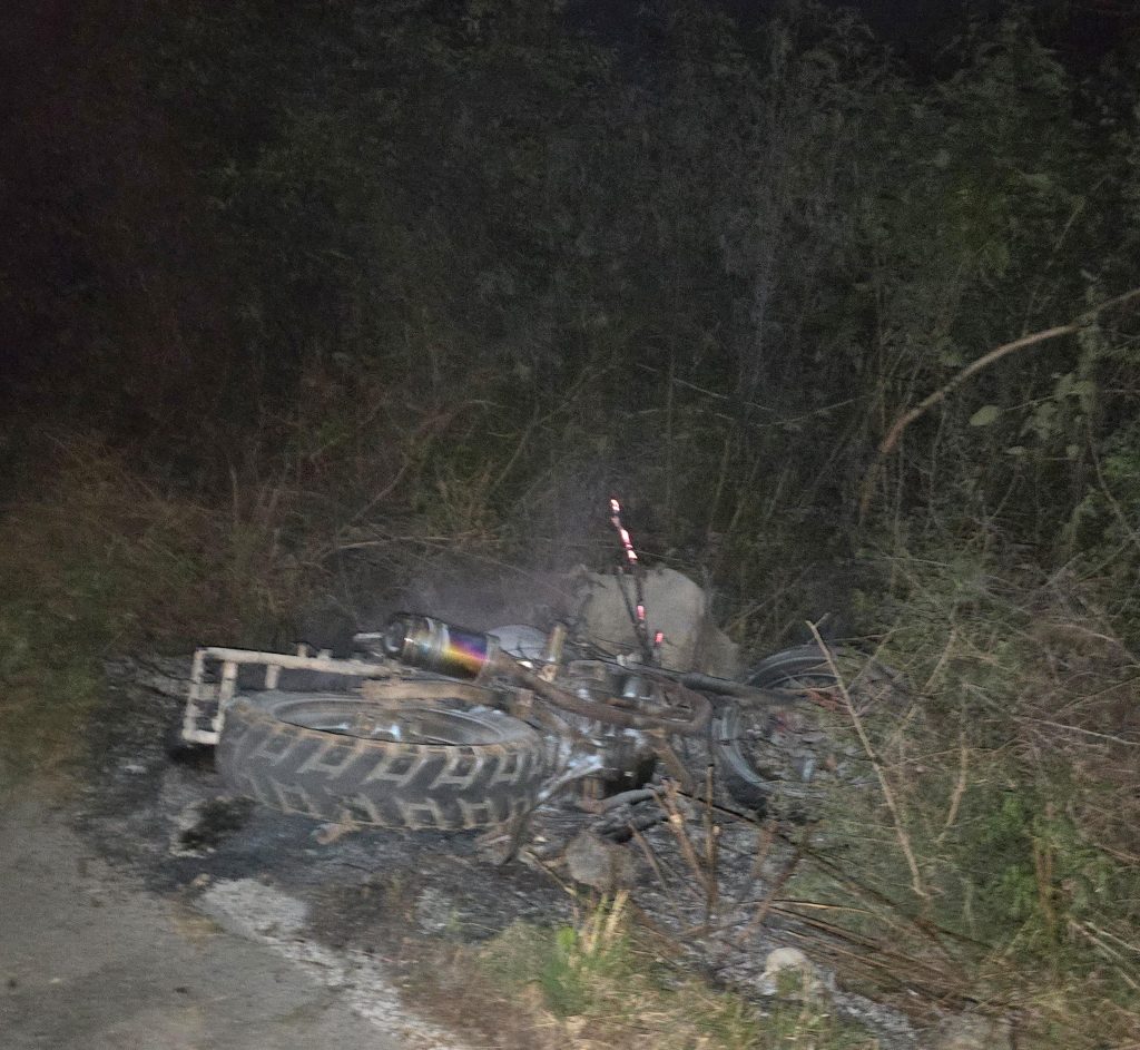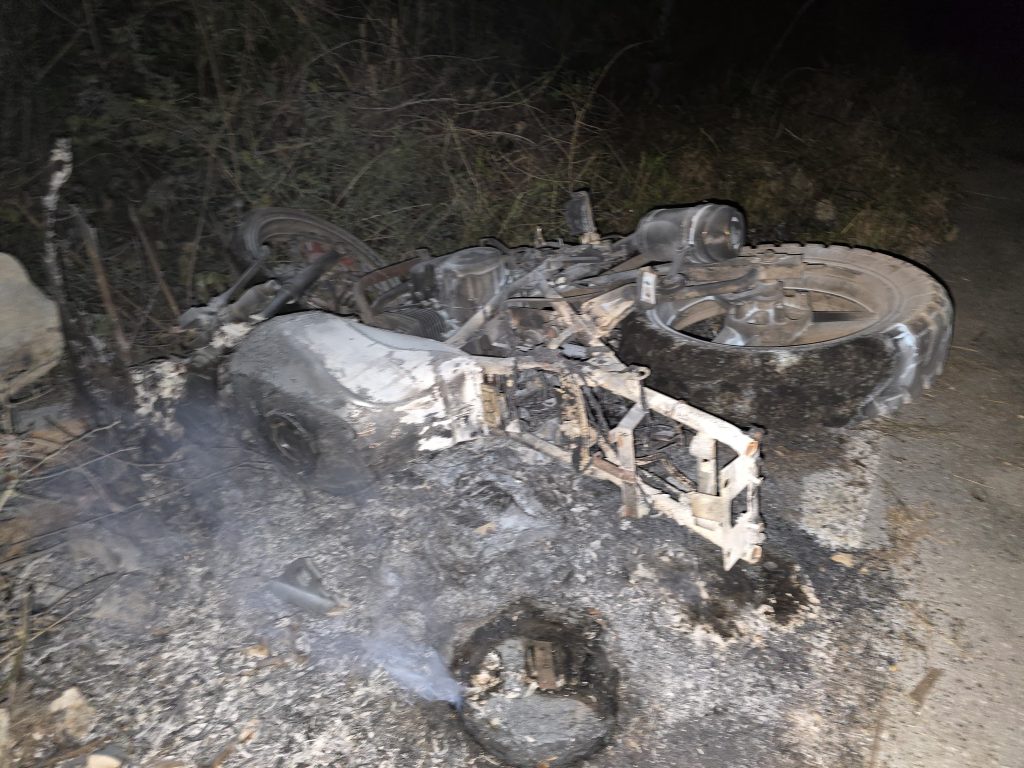 De acuerdo a lo averiguado poco después de las 9 de la noche testigos dieron aviso de que a escasos metros de llegar a este municipio, en la mera curva estaba ardiendo un vehículo de dos ruedas.