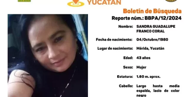 MÉRIDA, Yuc., 28 de agosto 2024.- Las autoridades emitieron un boletín de búsqueda correspondiente a un Protocolo Alba para tratar de localizar a Sandra Guadalupe Franco Coral, de 43 años.