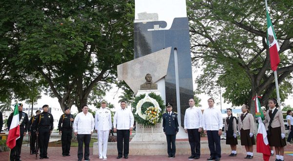 Acompañado del presidente de la Junta de Gobierno y Coordinación Política del Congreso del Estado, Felipe Cervera Hernández, Zapata Bello apostó una ofrenda floral y efectuó una guardia de honor ante el busto del ilustre militar para luego entregar premios a estudiantes de primaria y secundaria de escuelas regulares, indígenas y del Consejo Nacional de Fomento Educativo (Conafe) por haber tenido un destacado papel en el Concurso de Expresión Literaria “Símbolos Patrios” 2018.