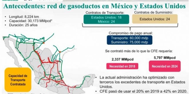 Detalló que durante los dos gobiernos federales pasados se hicieron contratos de una red de gasoductos privada: en materia de transporte son 18 en Estados Unidos y 24 en México; en suministro, son 24 en la nación vecina.