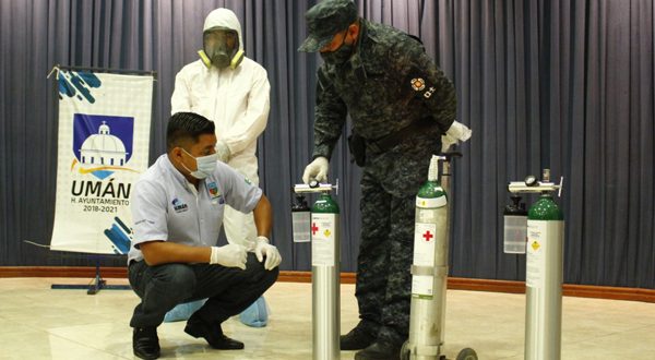 UMÁN, Yuc., 17 de julio 2020.- “En el Ayuntamiento de Umán nos hemos preparado para brindar una mejor atención ante algún caso urgente de COVID-19”, así lo mencionó el alcalde Freddy Ruz Guzmán durante la entrega de 3 tanques de oxígeno que le hizo a la Dirección de Protección Civil que servirán como equipos de primer respondiente, es decir que será de uso exclusivo de aquellos pacientes que tengan complicaciones respiratorias y a quienes se les será suministrado en su domicilio durante el tiempo en que tarde en llegar la ambulancia para su traslado a alguna Unidad Médica destinada para la atención a esta enfermedad.