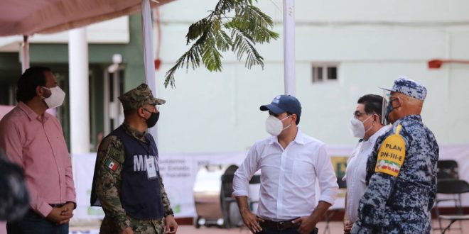 Acompañado del coordinador Estatal para la Vacunación Covid-19, capitán de Corbeta Carlos Gómez Montes de Oca y del comandante de la Base Aérea Militar Número 8, General de Ala Piloto Aviador Juan Ángel Jardón Aguilar, Vila Dosal verificó la preparación de este Colegio, así como la operatividad de las áreas que conforman este proceso, que son registro, triage, vacunación y recuperación, todo con el fin de corroborar que el procedimiento se lleve a cabo de forma ágil y en orden.