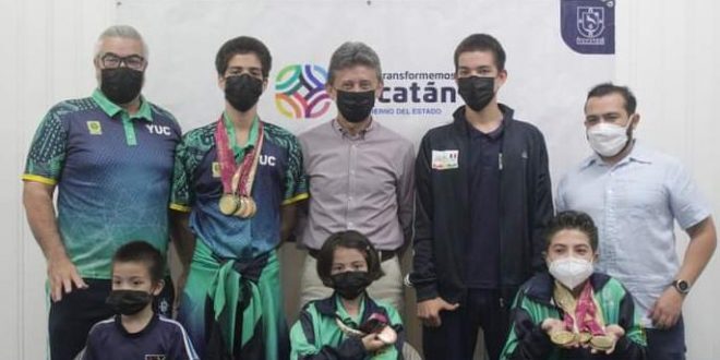 Los hermanos Sión, Atlas, Caissa y Cronos Galaviz Medina, además de Daniela María Mukul Aldana y Santiago Zacarías Rodríguez, visitaron a Carlos Sáenz Castillo, director del Instituto del Deporte (IDEY), quien les felicitó, deseó mucho éxito y aseguró que estará pendiente de su desempeño.
