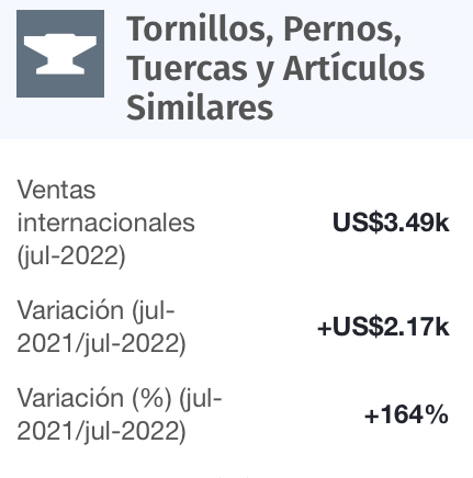 De acuerdo con la Secretaría de Economía del Gobierno de México la exportación desde Umán en producción de tornillos, pernos, tuercas y artículos similares se incrementó en un 164% en julio pasado, y en comparación con la misma actividad en julio pero del 2021, representando la producción de estos artículos el 69.7% del total de la producción del corredor industrial desde esta ciudad.