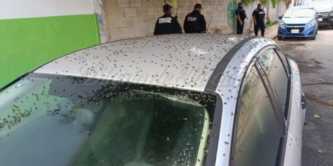 Elementos de la Secretaría de Seguridad Pública (SSP), se movilizaron de inmediato al lugar, donde estaba un auto Fiesta color gris, muy cerca de la esquina con la calle 49, lleno de las moscas conocidas coloquialmente como “panteoneras”.