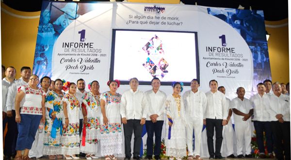 La ceremonia del primer informe de resultados inició con los honores al lábaro patrio a cargo de la Escolta y Banda de guerra municipales y por ser el Día Internacional de los Pueblos Indígenas, el Himno Nacional fue entonado en lengua maya por el coro “Tumben k’ay” de la primaria “Rafaél Cházaro Pérez”.