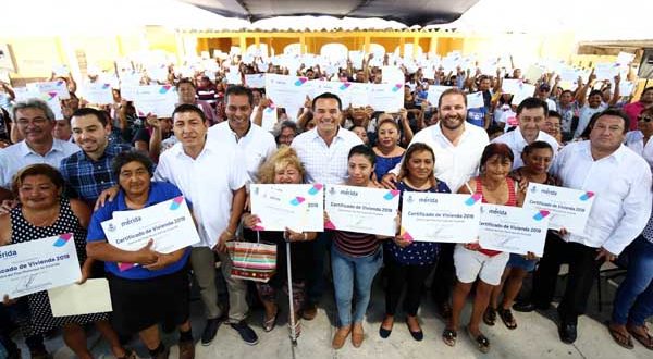 Mérida, 14 de marzo de 2019. — En cumplimiento del compromiso hecho con los habitantes de Mérida y sus comisarías, el alcalde Renán Barrera Concha entregó esta mañana certificados de acciones de vivienda y afirmó que los hechos trascienden a las palabras en la búsqueda del progreso y el bien común.