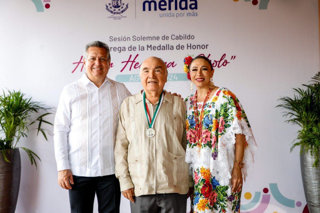 Mérida, Yucatán 12 de agosto de 2024.- En reconocimiento al maestro Tomás Ceballos Campos por sus 60 años de experiencia en la escena teatral, el Alcalde Alejandro Ruz Castro le entregó la medalla Héctor Herrera “Cholo” 2024, presea con la que se distingue a mujeres y hombres que con sus obras, trayectoria y aportaciones, enaltecen al teatro regional yucateco.