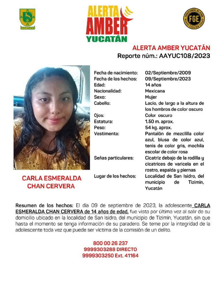 TIZIMÍN, Yuc., 11 de septiembre 2023.- La Fiscalía General del Estado activó una Alerta Amber Yucatán para pedir el apoyo de la comunidad a fin de localizar a Carla Esmeralda Chan Cervera, de 14 años de edad, desaparecida en Tizimín.