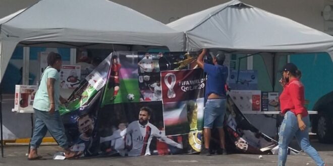 Esas personas instalan dos toldos cubiertos en un lado con lonas alusivas al fútbol, con imágenes de jugadores como Leo Messi y Neymar, así como el logo del Mundial de Catar.