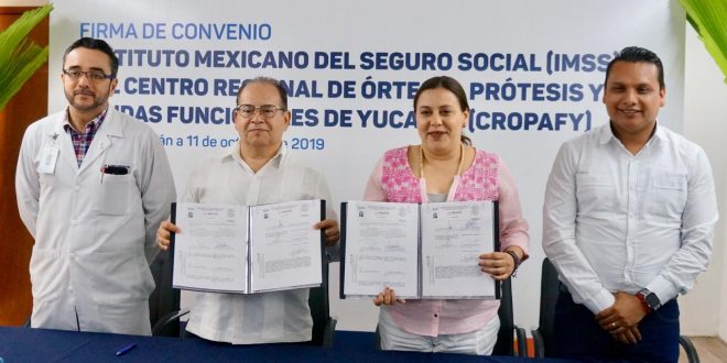 Mérida, Yucatán, 14 de octubre de 2019.- Derechohabientes, trabajadores en activo, pensionados y jubilados accederán a los beneficios de la labor conjunta entre el Sistema para el Desarrollo Integral de la Familia (DIF), a través del Centro Regional de Órtesis, Prótesis y Ayudas Funcionales (Cropafy), y la delegación local del Instituto Mexicano del Seguro Social (IMSS).
