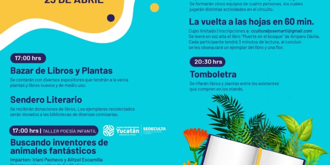 El programa especial del Día Mundial del Libro tendrá varias actividades a partir de las 5 de la tarde, como el Bazar de Libros y Plantas, el Sendero Literario, en el que se recibirán donaciones de libros los cuales se destinarán a bibliotecas de diversas comisarías. También se realizarán el taller de poesía infantil “Buscando inventores de animales fantásticos” a cargo de Iriani Pacheco y Alitzel Escamillla, el Rally de Letras y Flores en el que se formarán cinco equipos para realizar el circuito, así como “La vuelta a las hojas en 60 minutos” que consiste en que los participantes leerán en voz alta y por tres minutos la obra “Muerte en el bosque” de Amparo Dávila, y la “Tomboletra” en la que se rifarán plantas y libros entre quienes adquieran ejemplares en los stands. De igual forma se presentará “Encrucijada: Sincronía de Letras”, una antología de la Asociación Literaria y Cultural de Yucatán (ALICY).