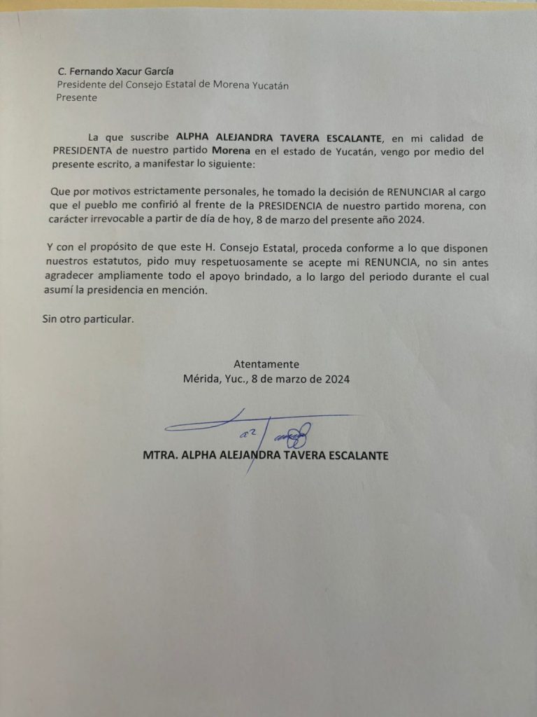 Debido a causas personales, la ex alcaldesa de Valladolid informó al delegado del Comité Ejecutivo Nacional, Óscar Cantón, designado por la doctora Claudia Sheinbaum, su decisión de tener que renunciar al cargo de presidenta del Comité Estatal de Morena por causas personales, pero que así mismo seguirá apoyando a la Doctora Claudia Sheinbaum, a “Huacho” Díaz Mena y a todas y todos candidatos del movimiento para que Morena gobierne Yucatán.