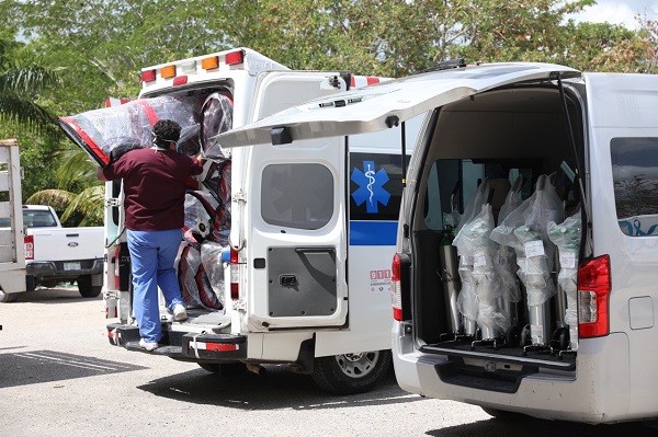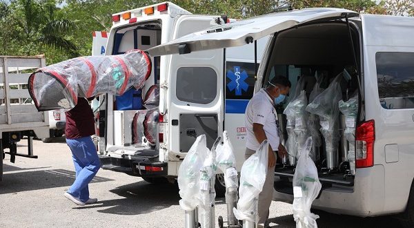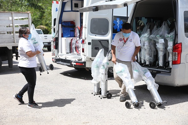 Por disposición del Gobernador Mauricio Vila Dosal, se realizó la entrega de 11 ventiladores, 24 tanques de oxígeno y 12 cápsulas aislantes, equipos que facilitarán la labor del personal ambulatorio durante la movilidad de personas con esta enfermedad.