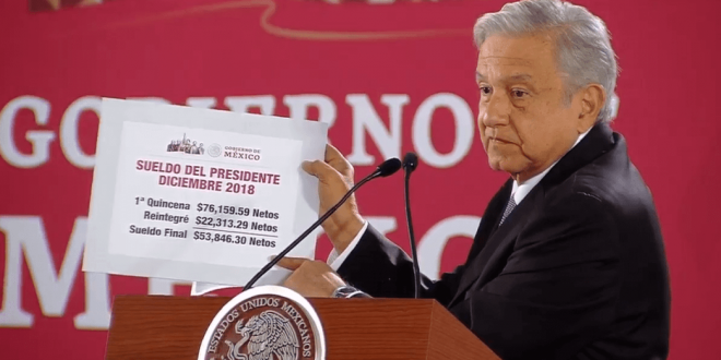Andrés Manuel López Obrador anunció este martes que ya recibió su primera quincena como presidente de México. Explicó, durante su rueda de prensa matutina en Palacio Nacional, que recibió 76,159.59 pesos, pero como esta cantidad estaba definida por la antigua ley, devolvió 22,313.29 pesos.
