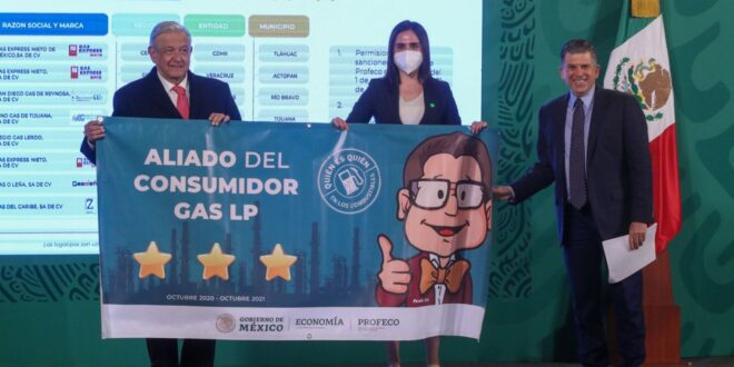 El presidente de México, Andrés Manuel López Obrador (AMLO), entregó hoy, 6 de diciembre de 2021, reconocimientos “Aliado del consumidor” a gaseras y gasolineras por vender kilos de a kilo y litros de a litro.