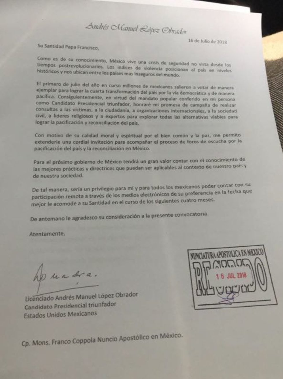 Tras la polémica surgida por la presunta participación del Papa Francisco en los foros por la paz, el virtual presidente electo, Andrés Manuel López Obrador, le envió una carta para invitarlo de manera formal a participar en este ejercicio que se llevará a cabo a partir del 7 de agosto.