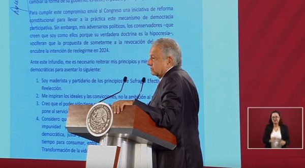 Para cumplir este compromiso envié al Congreso una iniciativa de reforma constitucional para llevar a la práctica este mecanismo de democracia participativa. Sin embargo, mis adversarios políticos, los conservadores – que creen que soy como ellos porque su verdadera doctrina es la hipocresía-, vociferan que la propuesta para someterme a la revocación del mandato encubre la intención de reelegirme en 2024.