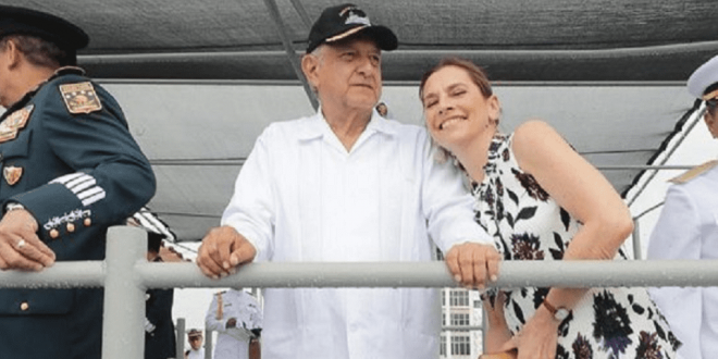 Veracruz.-El presidente Andrés Manuel López Obrador y su esposa Beatriz Gutiérrez Müeller fueron captados como novios en el Buque Papaloapan, después de abordar la embarcación y firmar el libro de visitantes distinguidos, quienes fueron acompañados por el secretario de Marina, José Rafael Ojeda Durán, durante el traslado a la celebración del Día de la Marina Nacional.