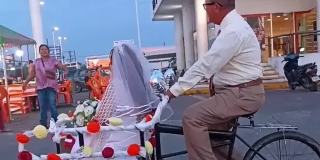 En un video que circula en redes sociales, se ve a Isabel vestida con un traje de novia a bordo del triciclo mientras que Arturo, con una camisa amarilla y pantalón café, al mando del vehículo.