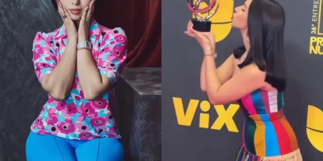Con orgullo, Ángela presumió su premio en sus redes sociales y compartió fotos y videos con el segundo atuendo, el cual también usó para cantar en vivo “Qué Agonía” con Yuridia. Se trata de un vestido de colores mexicanos que parece simular un reboso por el corte en la parte inferior, dejando por un rato los largos vestidos mexicanos y ampones que la caracterizaban y apostando por looks más juveniles.