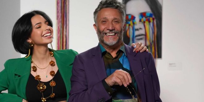 A través de Instagram, la más joven de la dinastía Aguilar publicó una imagen en la que aparece abrazada del autor de “Al lado del camino”. Mientras que ella porta un blazer verde y una ombliguera negra, el argentino lleva una colorida camisa y un saco púrpura.