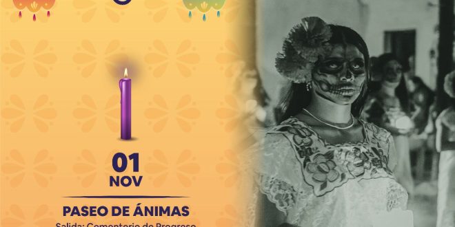 El Paseo de Ánimas iniciará en el cementerio municipal de Progreso y recorrerá la calle 33 hasta concluir en el Parque Independencia, donde el alcalde invita a las y los progreseños a armar su altar desde casa y compartir los recuerdos de sus seres queridos, o bien, a acompañar en el paseo portando vestimenta alusiva.