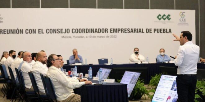 Mérida, Yucatán, 11 de marzo de 2022.- El Gobernador Mauricio Vila Dosal planteó, ante integrantes del Consejo Coordinador Empresarial (CCE) del estado de Puebla, las ventajas competitivas y lo que se está realizando en Yucatán, para mantenerlo como un lugar ideal para vivir y atraer inversiones, que generen más y mejores empleos para las familias.