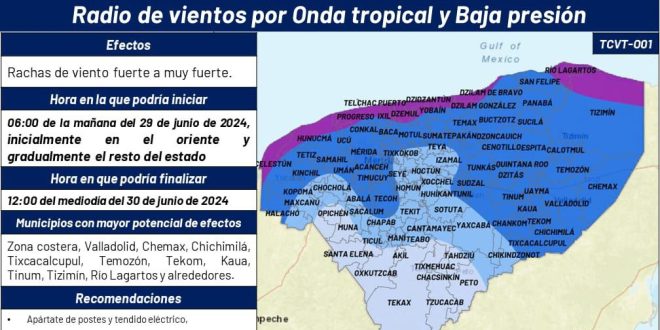 Mérida, 28 de junio de 2024.- La Coordinación Estatal de Protección Civil (Procivy) llamó a la población de los municipios del oriente del estado, así como de las zonas costeras a tomar precauciones ante las intensas lluvias y fuertes vientos que se esperan de la Onda Tropical No. 6 a partir de la madrugada de este sábado 29 de junio.