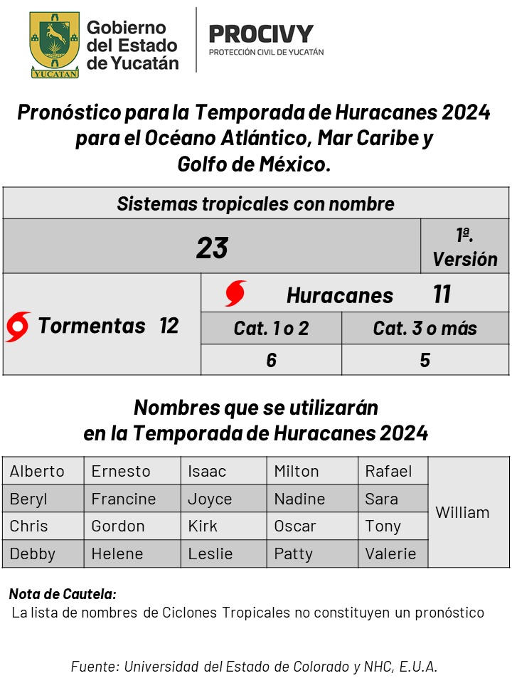 Mérida, 4 de abril de 2024.- Ante previsiones de temperaturas más cálidas de lo normal en el océano Atlántico, factor que propicia el desarrollo de ciclones tropicales, la Coordinación Estatal de Protección Civil (Procivy) de Yucatán informa que para la próxima temporada se formarán 23 tormentas con nombre, de los cuales once alcanzarían la categoría de huracanes, según pronósticos.