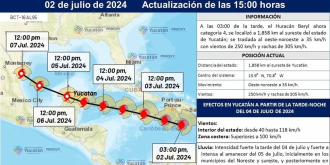 Mérida, 2 de julio de 2024.-  Ante la aproximación del huracán “Beryl” a Yucatán, ubicado esta tarde a mil 858 km al sureste del estado con vientos de categoría 4, de 250 km/h y rachas de 305 km/h, la Coordinación Estatal de Protección Civil (Procivy), llama a la población a tomar sus precauciones, resguardarse en sus domicilios o en su caso acudir a los refugios temporales.