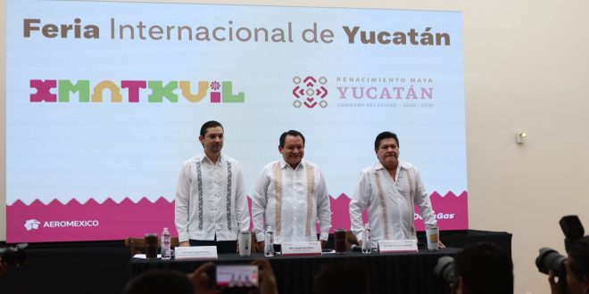 · El gobernador Joaquín Díaz Mena presentó en la Ciudad de México la Feria Internacional Yucatán Xmatkuil, que en su 50 Aniversario espera recibir más de tres millones de visitantes. – Destaca que se trabaja para hacer de Yucatán una plataforma logística y que se integre al corredor industrial del Istmo de Tehuantepec, para ofrecer una opción de inversión en el marco del nearshoring.