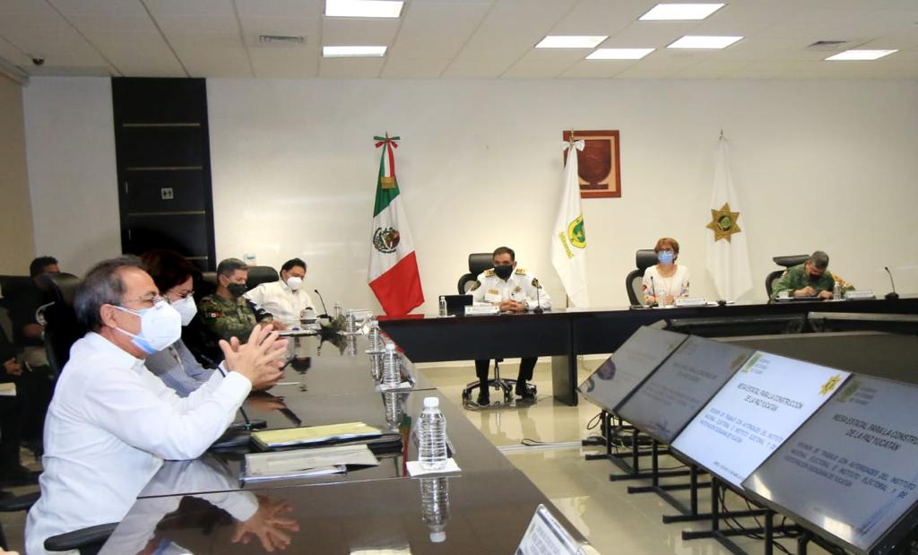 Mérida, Yucatán, 14 de abril de 2021.- Para coadyuvar a garantizar las condiciones de seguridad, así como en la aplicación de las medidas de prevención sanitarias para la protección de la salud en las próximas elecciones del 6 de junio, este día se llevó a cabo la reunión de trabajo de la Mesa Estatal para la Construcción de la Paz con la participación de las autoridades electorales del Estado de Yucatán.