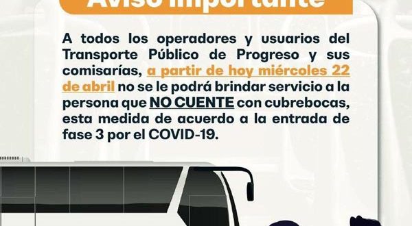 Progreso, Yucatán a 22 de abril de 2020.- Luego de que ayer martes la Secretaría de Salud federal decretará el inicio de la fase 3 de la contingencia sanitaria por el COVID-19 en todo el país, el alcalde Julián Zacarías Curi hace un llamado a operadores de transporte público del municipio y usuarios del mismo a seguir las medidas obligatorias que ha instruido el gobierno federal y estatal, de lo contrario habrá sanciones.