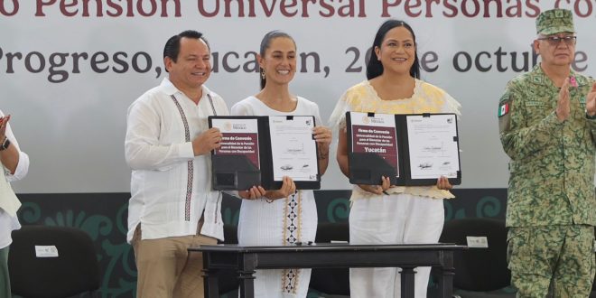 Por su parte, la presidenta de México destacó que a pesar de que aún no se cumplen los primeros 30 días de su Gobierno; “ya estamos firmando el convenio para que en Yucatán la Pensión para Personas con Discapacidad sea universal, si nace un niño o niña con algún problema de discapacidad, hasta que lleguen a ser adultos mayores, van a tener su apoyo de gobierno. La mitad lo pone el Gobierno del Estado y la otra mitad la ponemos desde el Gobierno Federal, así que ya es un hecho en Yucatán”.